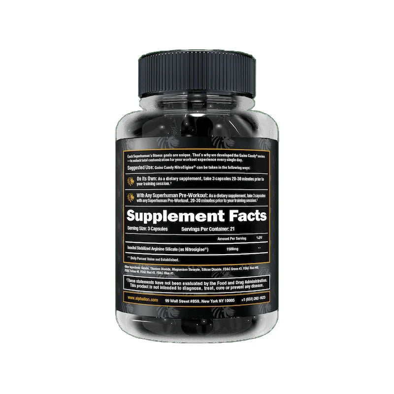 Enhance your physical performance with Gains Candy™ Nitrosigine® (21 servings), a patented complex that supports long-lasting nitric oxide production. Nitrosigine® promotes increased pumps, nitric oxide production, cognitive focus, and improves blood flow.